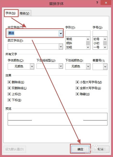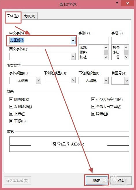 5、在“查找字体”对话框“字体”选项卡,中文字体选择“方正舒体”,然后单击“确定”。