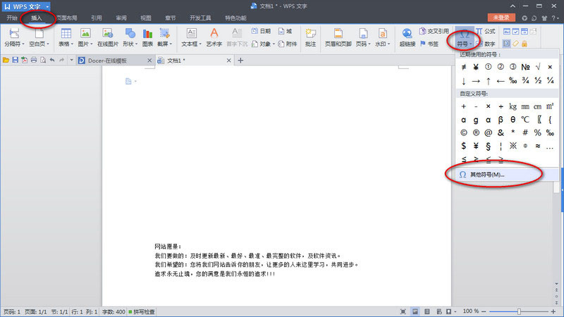 1、首先我们打开WPS中的文字,进入“插入”菜单,点击“符号”的下拉菜单选择“其他符号”