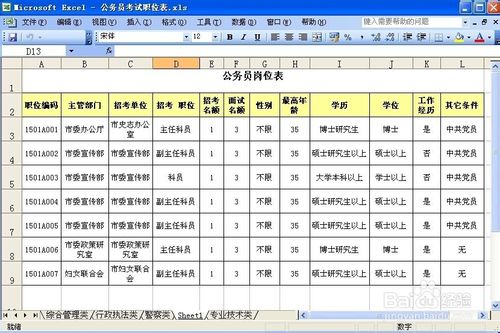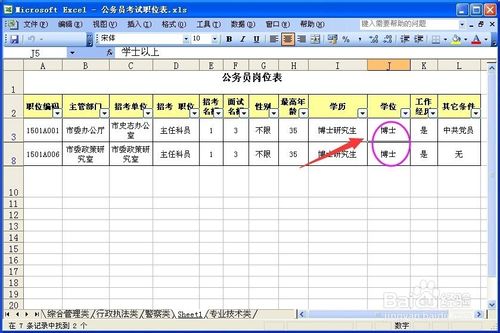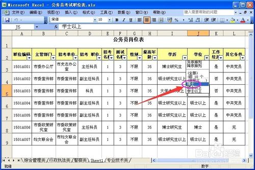 例如:我们给“学位”设置条件为博士。这时,在工作表中就只显示“博士”的数据列了。