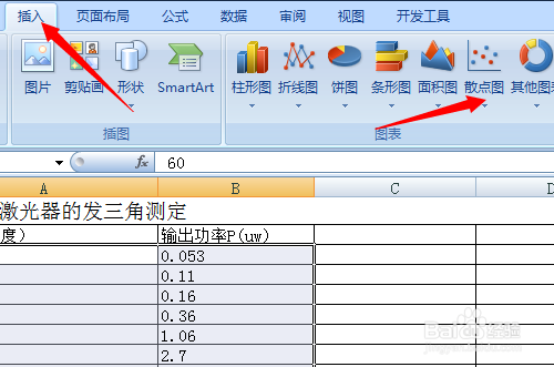 在菜单栏中点“插入”,然后选择“散点图”下面的下拉菜单。