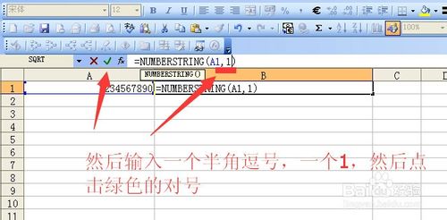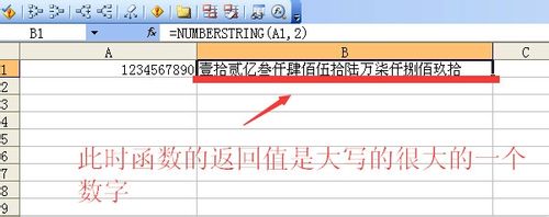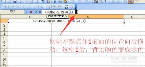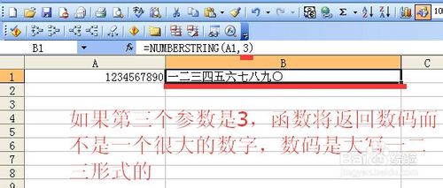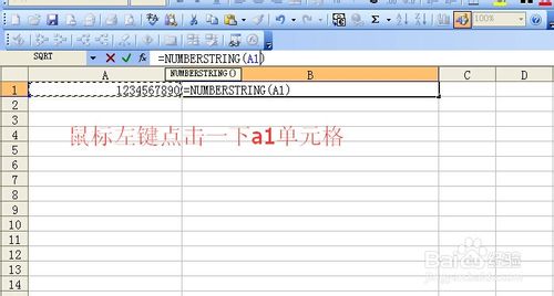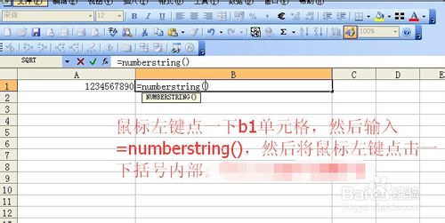 鼠标左键点一下b1单元格,然后输入=numberstring(),然后将鼠标左键点击一下括号内部