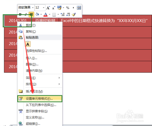 选中需要做日期转换的“20141201”,鼠标右键选择“设置单元格格式”。
