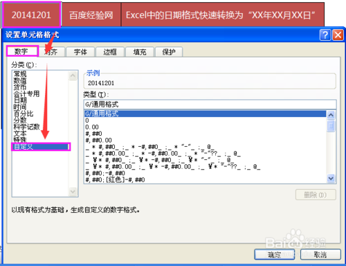 在跳出的“设置单元格格式”文本框中,选中“数字”选项卡下的“自定义”一项。