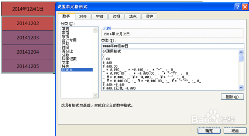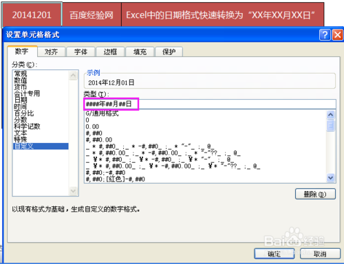 在“设置单元格格式”文本框,将类型填写为“####年##月##日”。