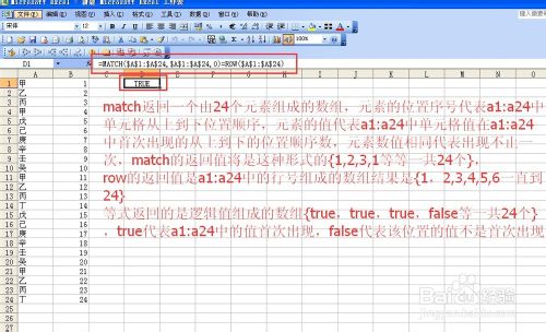 等式返回的是逻辑值组成的数组{true,true,true,false等一共24个},true代表a1:a24中的值首次出现,false代表该位置的值不是首次出现