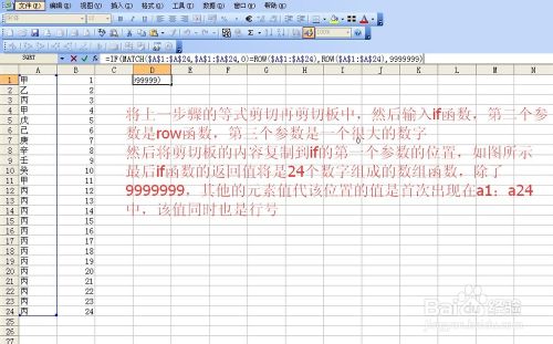 最后if函数的返回值将是24个数字组成的数组函数,除了9999999,其他的元素值代该位置的值是首次出现在a1:a24中,该值同时也是行号