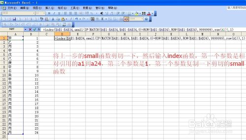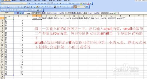 将上一步的small函数剪切一下,然后输入index函数,第一个参数是相对引用的a1到a24,第三个参数是1,第二个参数复制一下剪切的small函数