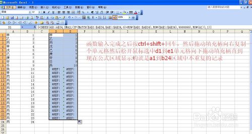 现在公式区域显示的就是a1到b24区域中不重复的记录