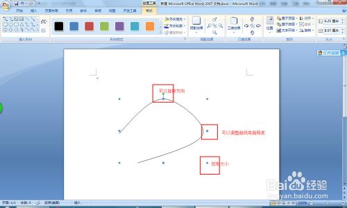 通过调节两端的控制点,可以改变线段的长度和角度,系统自动切换到形状格式选项卡,可以设置形状的颜色,线条的粗细等。我们可以根据下图的提示来进行调整曲线。