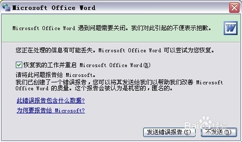 第一步,打开word,出现了一个提示,显示着“word遇到问题需要关闭。我们对此引起的不便表示抱歉。”下面有选项“恢复我的工作并重启word”,选中它。点下面的“不发送”。在出现的提示中写到“是否使用安全模式启动word”时,点“是”,这样就可以以安全模式启动word了。但是这样每次开都很麻烦。所以我们可以进行如下设置。
