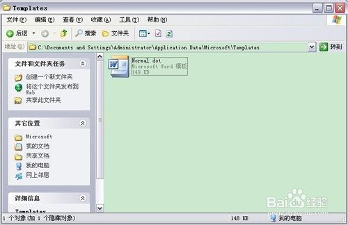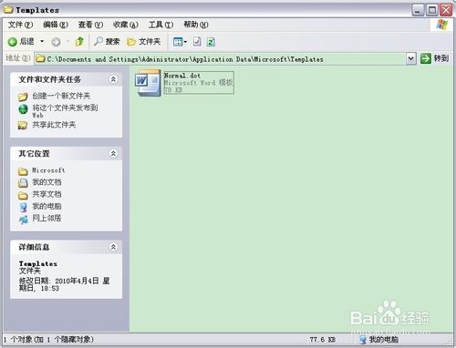 第三步,在资源管理器的上方地址栏中输入:“C:\Documents and Settings\Administrator\Application Data\Microsoft\Templates”,你会发现出现了一个文件“Normal.dot”,这是word公用模板的文件。