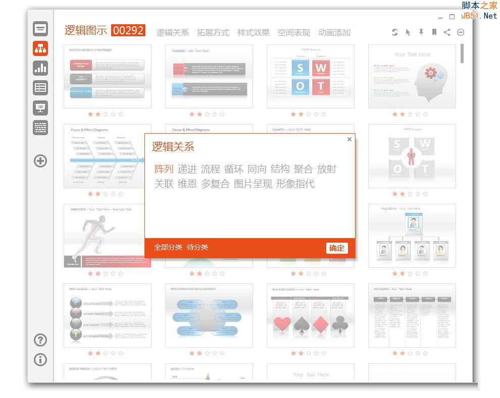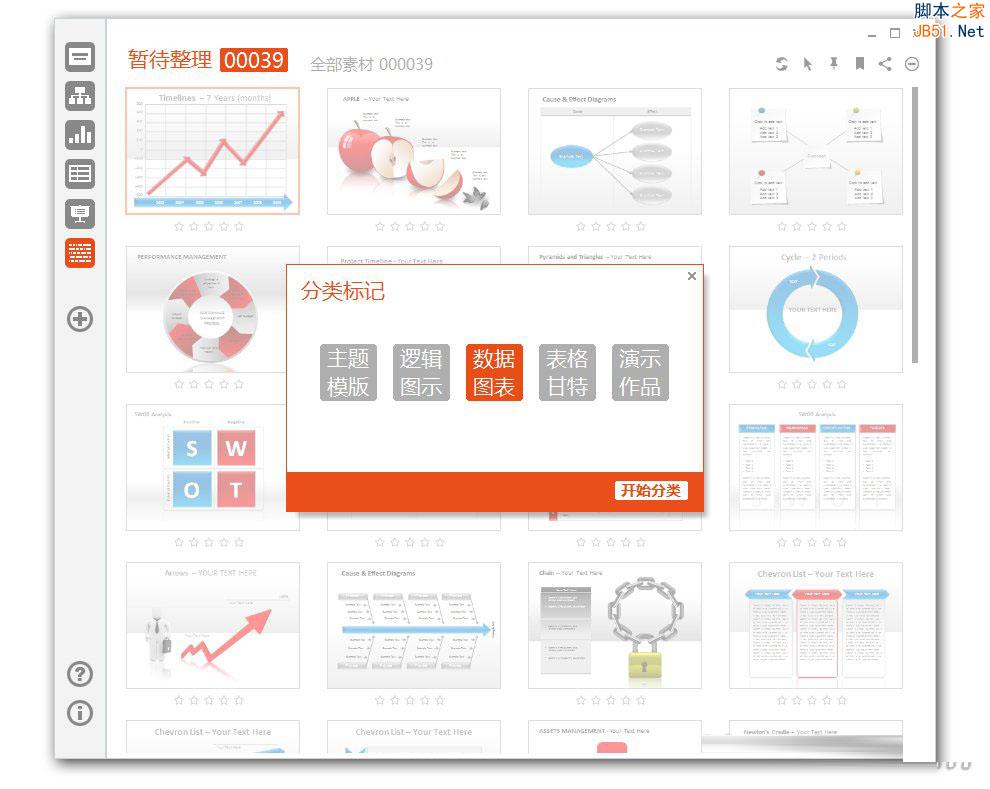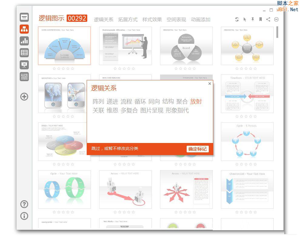 进入主分类后可对PPT素材进行快速标签,以【逻辑图示】为例,步骤如下: