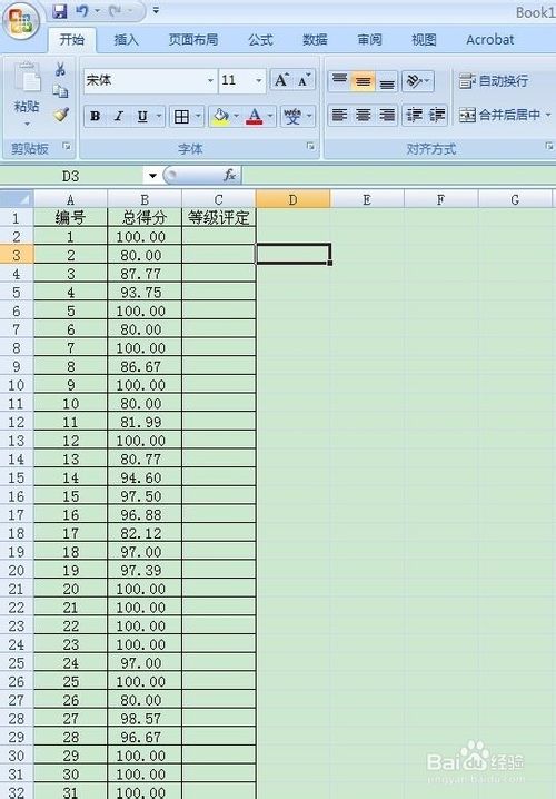 然后将事先准备好的成绩清单和编号录入到excel里来,这个是数据的源头很重要,一定要核对正确,比如编号,成绩等,因为这个直接影响到最后评价等级的准确性,见图所示。