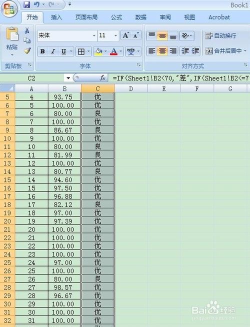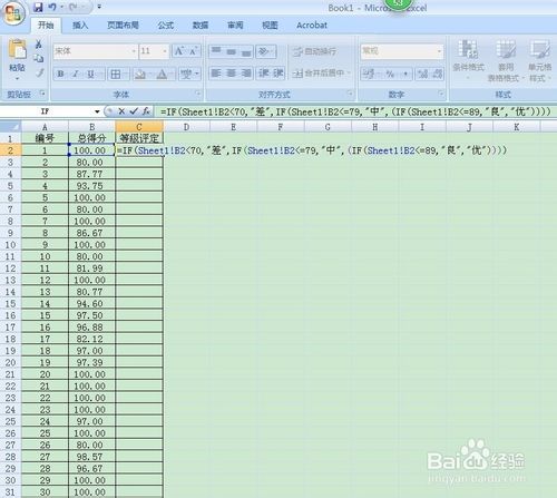 然后我们要在该表单的等级评定中取在列C中选择C2位置,输入公式=IF(B2<70,"差",IF(B2<=79,"中",(IF(B2<=89,"良","优"))))。公式的意思就是当B2成绩列中的成绩高于89分时,则打优;低于89分高于79分时,则打良;低于79分高于70分时,则打中;低于70分时,则打差;依次类推,举一反三,这样等级公式就输好了。