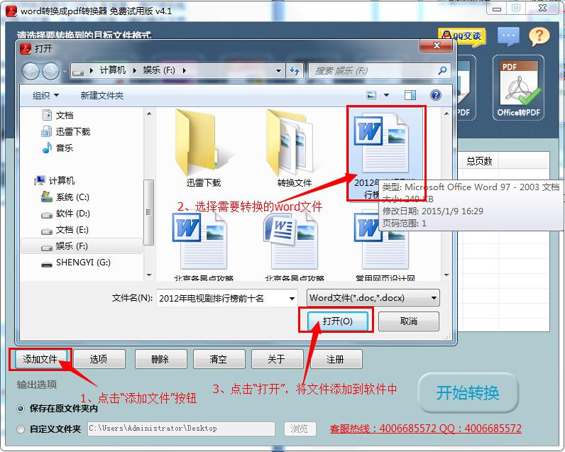 第二步:点击“添加文件”按钮,将需要转换的word文件添加到软件中。大家也可以不通过“添加文件”按钮就将word文件添加到软件中,大家只需要选定word文件,使用鼠标将其拖拽到软件界面中,就可实现文件的添加。