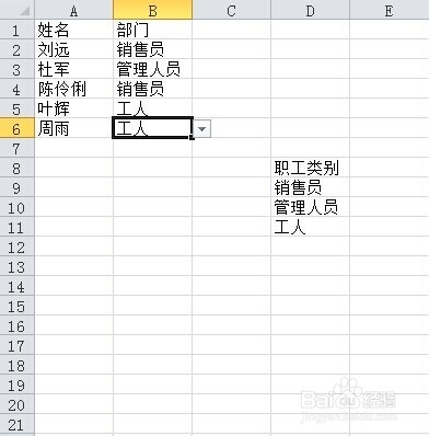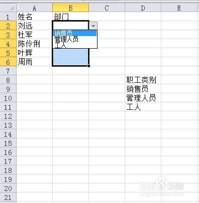 对话框出来后,设置有效性条件允许“序列”,数据来源为“销售员,管理人员,工人”(中间间隔符号为英文标点符号)