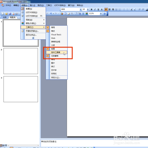 打开需要插入Flash文件的ppt。找到“视图”——“工具栏”——“控件工具箱”,左键单击。
