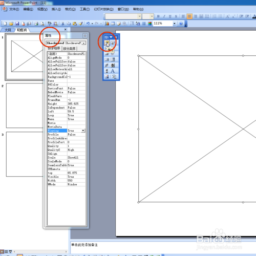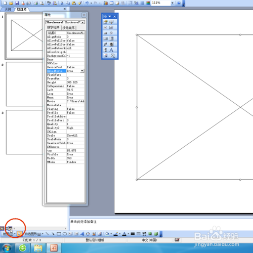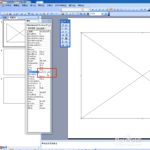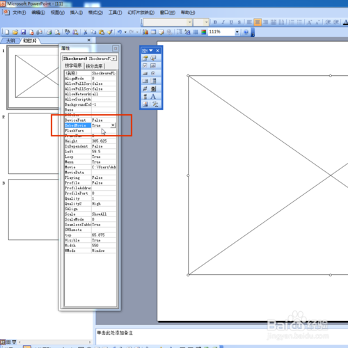 在属性框里的embedmovie的右侧选择”True“。(注意:这样做的好处是尽管ppt与Flash不在同一个文件夹里Flash还可以播放!)