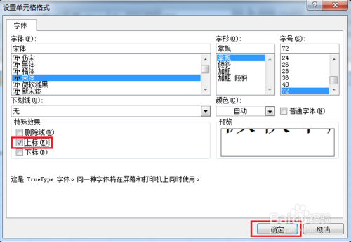 五、在弹出的“设置单元格格式”对话框中,勾选“上标”并单击“确定”。