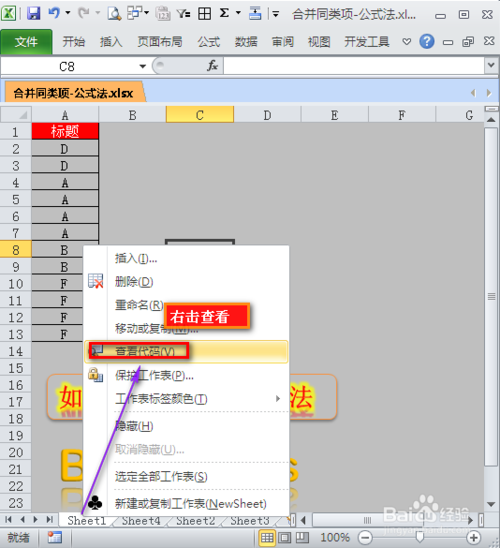 首先,我们在任意工作表标签上右击选择,查看代码,进入下一步。