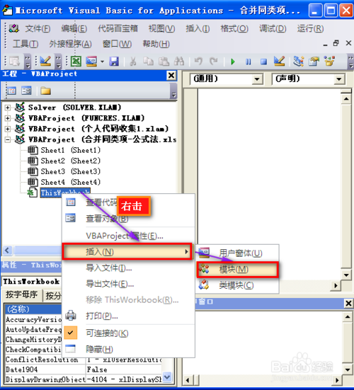 进入VBE界面以后,我们在工程窗口在,在工作表名称中标签上右击插入,选择插入模块。