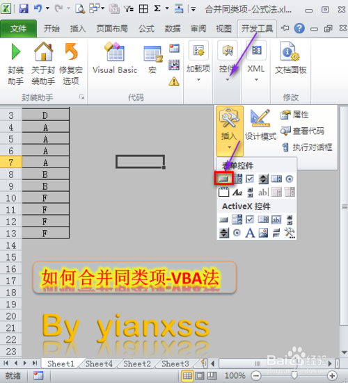 在开发工具中点击控件插入一个按钮控件,在工作表中鼠标拖动一个大小合适的按钮。