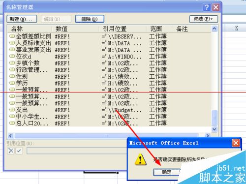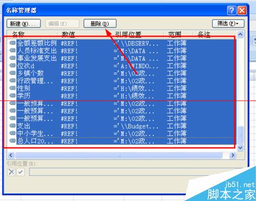 3、在弹出的“名称管理器”窗口中删除里面所有的名称