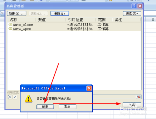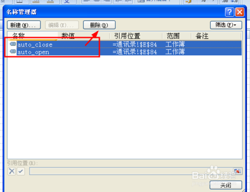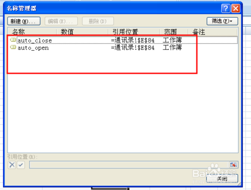 5、再新建一个名称为:auto_close,点击确定后,名称管理器中就有:auto_open、auto_close两个名称了。然后全选他们,把它们删除,最后关闭名称管理器。就这样就搞定了哦!