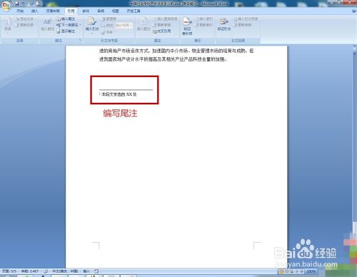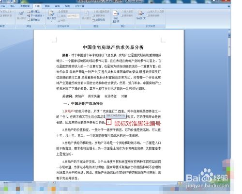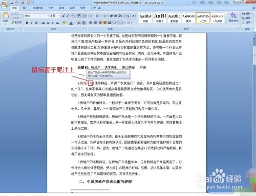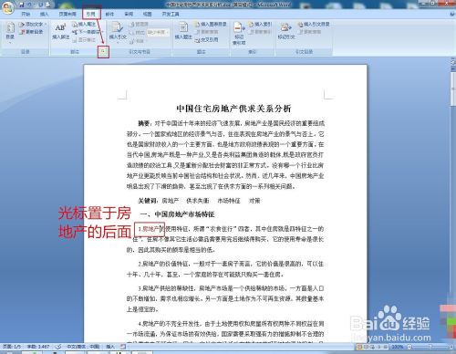 1、首先我们先打开一篇文档,把光标放在我们需要注释的字后面。这里我选择的是房地产三个字。然后引用,在点击脚注边上的按键,如图所示。