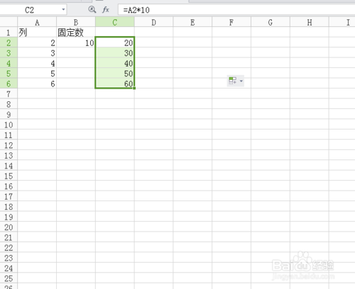 2、假设是A列,要剩固定数(10),那么在输入C2=A2*$B$2,修改B2,确定回车后,用鼠标放在单元格的右下角黑点处,呈黑十字时,向下拉动鼠标填充。c列就是你要 。如图下