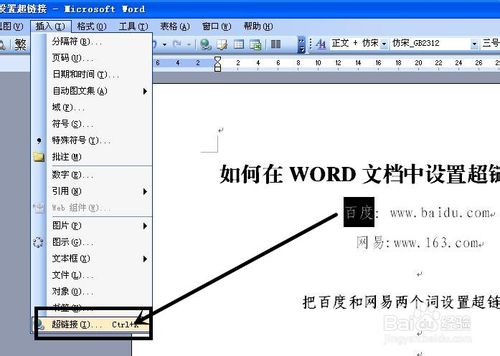 1、首先是打开需要设置word文档,选择需要设置的字(比如:图中的百度),在插入菜单选择最后一个命令,超链接命令并单击,在弹出的“插入超链接”对话框中可以看到:连接到,要显示的文字,原有文件或网页,点击它,可以选择查找范围,还可以从当前文件夹,浏览过的页,近期文件进行选择,在下面的地址栏目中可以输入:百度的地址“http://www.baidu.com”并点击确定。返回的word文档中,并按下ctrl键,弹出默认浏览器并打开百度首页(如图)