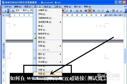 3、还可以链接到书签里,也就在文档的内容的某个书签上,首先选择需要设置的书签页,在插入菜单中选择书签,在弹出的“书签”对话框中,输入书签名字,并点击“添加”按钮,返回到word文档中,点击需要插入书签链接的字并右击,在弹出的菜单中选择超链接,点击“本文档中的位置”并选择书签下面刚才设置的“测试页”书签,并点击确定按钮。在按下ctrl键,页面转到书签页(如图)