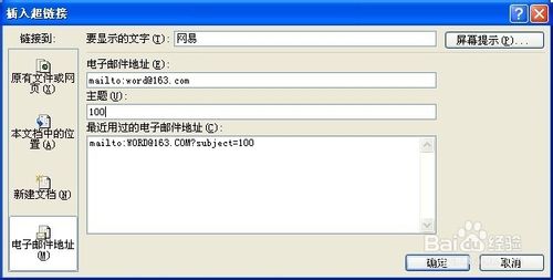 5、还可以链接到电子邮件地址:同样先选择需要设置的文字,右击选择超链接命令,点击“电子邮件地址”输入电子邮件地址(例如:word@163.com,要显示的文字为:网易,主题为:100)。点击确定完成。返回到设置页面中,在按下ctrl键,页面转到邮件发送对话框中(如图),输入需要的内容点击发送。
