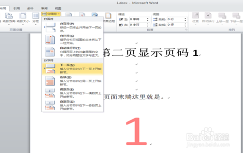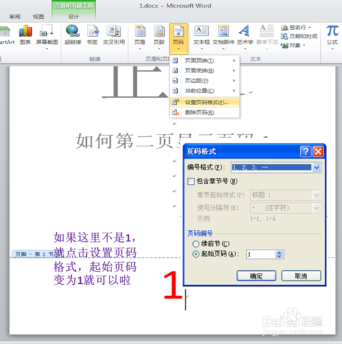 5、然后在第二页开始插入页码。页码就显示1啦!~