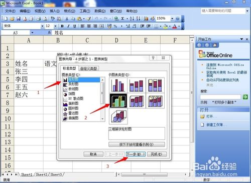 5、弹出了一个“图表向导”选项,先在左侧选择你想要的图表类型,有柱状图、饼状图等,我们以柱状图为例,在选择右面的子图标类型,我们选第四个图形。然后点击“下一步”。