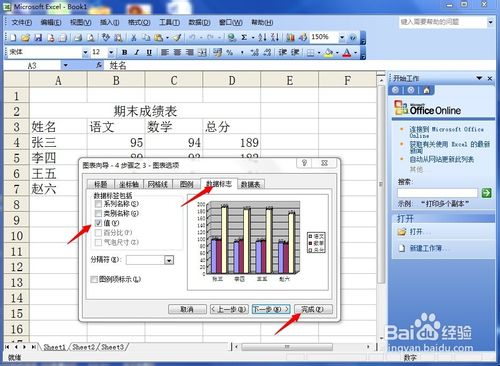 7、为了能够更加直观,我们通常将柱状图的上面填上具体数字,选择“数据标志”,左侧出现的内容中,将“值”一项前面打钩,最后点击“完成”按钮。