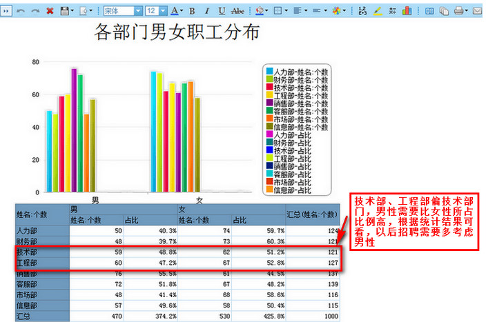 各部门男女职工的分布,通过企业管理学理论,企业技术、工程、信息等偏技术型部门的男职员比例要稍大一些,客服、人力等服务型部门的女职员比例稍大一些,这样才有利于企业的发展。那么通过以下的分析,可以得到企业现状,发现技术部、工程部的女职员比例高于男职员,未来一段时间内,人事部在招聘上,人员多考虑男性,女职员可适当减少,如下图分析情况