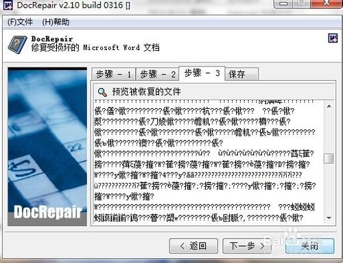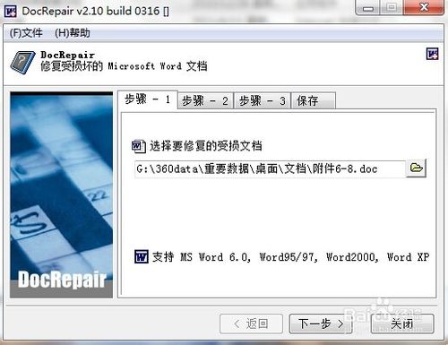 1、运行软件,选择步骤1,添加一篇无法正常读取的doc文件,单击下一步按钮。