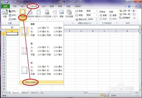 2、点击工具栏中的“页面布局”,再在子菜单中选择“页边距”,然后在下拉菜单中选择“自定义边距”。