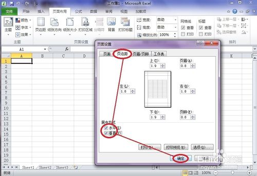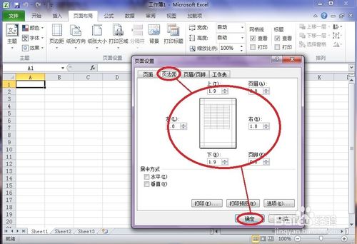 4、在页面设置对话框中点击”页边距“,再各输入”上、下、左、右“几个方向的边距值,最后点击”确定“。