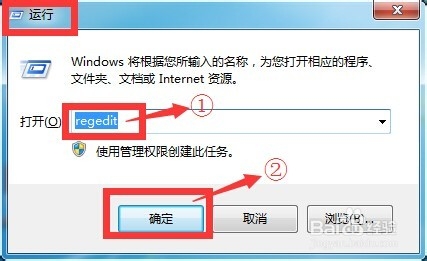 1、点击左下角“开始”按钮点击运行,或者直接按下“WIN+R”快捷键,打开运行对话框,输入“regedit”命令,单击确定。
