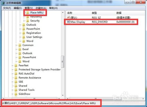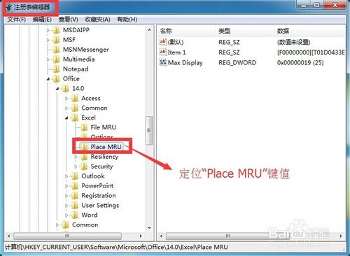 2、在弹出的“注册表编辑器”中找到如下键值“HKEY_CURRENT_USER\Software\Microsoft\Office\14.0\Excel\Place MRU”