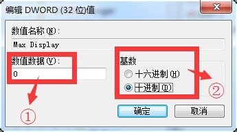 4、在弹出的“DWORD(32位)值”对话框中,选中“十进制”按钮,并修改“数值数据”为“0”,单击“确定”按钮,关闭对话框。