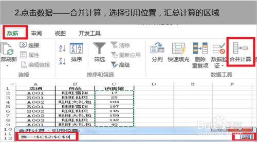 2.点击数据——合并计算,选择引用位置,汇总计算的区域。