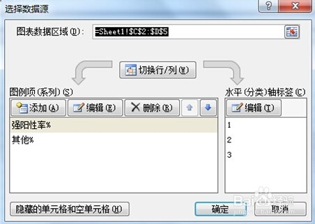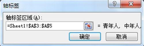 8、单击【选择数据源】对话框右侧的【水平(分类)轴标签】下的【编辑】按钮,弹出【轴标签】对话框,此时单击A3单元格,拖动鼠标选中A3:A5单元格区域,在【轴标签】对话框的【轴标签区域】显示“=Sheet1!$A$3:$A$5”。