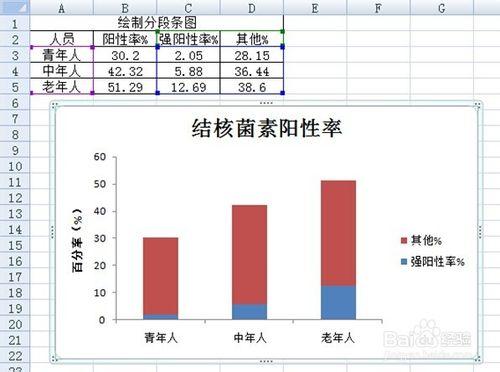强阳性率为阳性率的一部分,因此可以将阳性率分解为强阳性率与其它两个组成部分,整个直条代表阳性率,所以该数据资料宜绘制分段条图来分析。