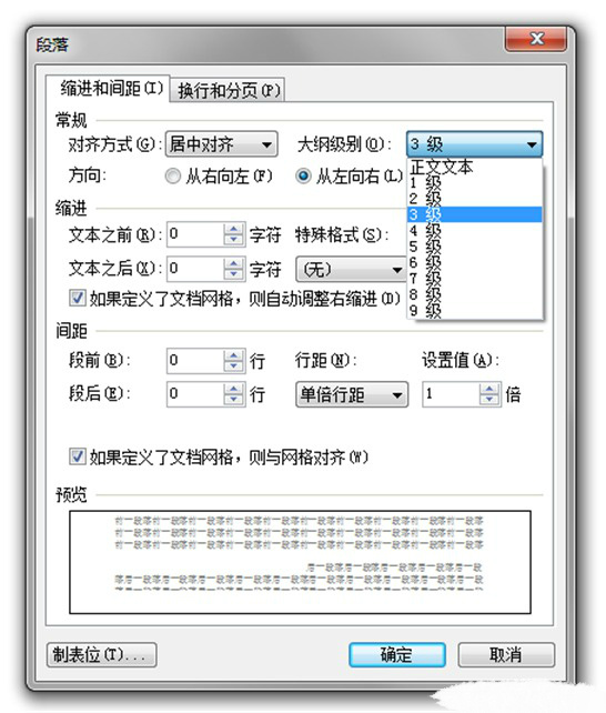 标题居中、段落左右对齐等也不用很麻烦地每次都去人为地设置,也有更省事办法:仍然到“段落”设置窗口,依次在“常规”一组的“大纲级别”下拉列表框中选择“正文”“1级”“2级”……“9级”,然后分别设置左侧的“对齐方式”,对于正文我们选择“左对齐”或“两端对齐”,而对于1到9级标题,通常版式是选择“居中对齐”。这样设置之后,当你输入各级标题或正文并应用了这种样式后,各自的对齐便自动完成,不需要人为去设置或调整。