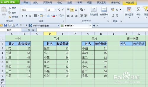 1、打开原始表格数据,本表中一共有前三个月的会员积分数据,现在需要统计到第一季度下面;