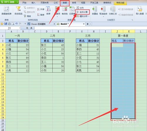 2、选择第一季度列表下面的表格,点击“数据”->“合并计算”;