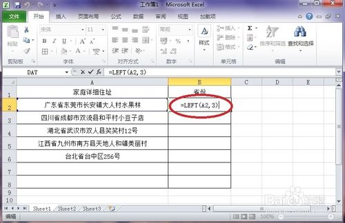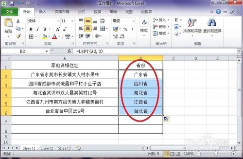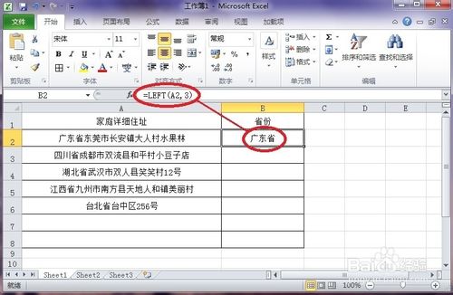 4、回车就能看到函数已经生效了,在单元格中显示了”广东省“三个字,截取成功。